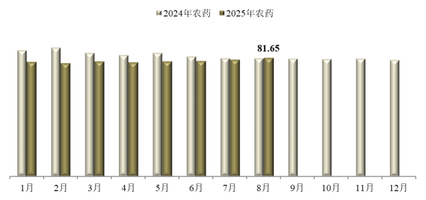 8月,中国农药价格指数持续回涨。据中国农药工业协会统计,8月农药价格指数(CAPI)为81.65,环比上涨1.50%,同比上涨0.29%。本月市场需求稳定,终端市场用药有所放缓,企业停工检修情况增加,开工随订单调整;部分企业调整主要产品价格,草甘膦、2,4-滴、丁草胺、丙溴磷、咪鲜胺等产品成交价格上涨。