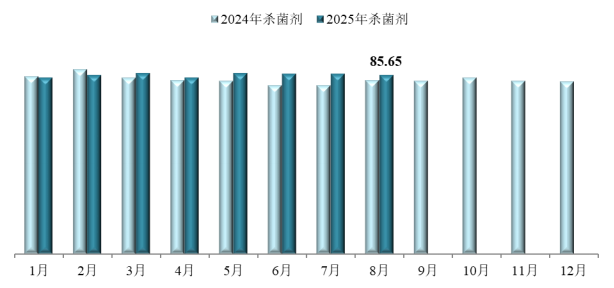 8月,杀菌剂价格指数为85.65,环比下跌0.86%,同比上涨2.88%。监测在内的31种杀菌剂产品中,加权平均成交价格环比上涨的8种,环比持平的3种,环比下跌的18种;加权平均成交价格同比上涨的10种,同比持平的1种,同比下跌的17种。