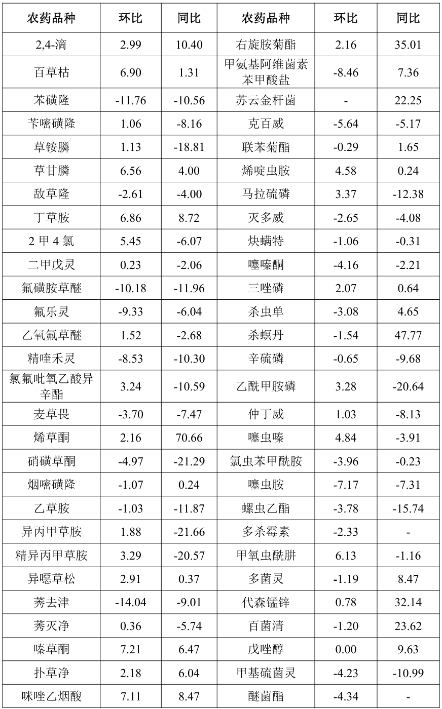 本月,除草剂价格指数继续保持上涨势头,其中2,4-滴、百草枯、草甘膦和丁草胺等原药加权平均成交价格上涨显著,带动除草剂价格指数上涨3.81个百分点;莠去津原药加权平均成交价格环比下跌14.04%,这主要受生产企业调整价格所影响。杀虫剂价格指数环比上涨0.42%,其中,丙溴磷原药加权平均成交价格环比上涨20.57%,主要系部分企业订单量和价格调整影响。杀菌剂价格指数继续小幅回落,环比下跌0.86%,多菌灵、代森锰锌、百菌清、戊唑醇、丙环唑、苯醚甲环唑等大宗产品价格基本稳定,涨跌幅在±2%以内;甲基硫菌灵、醚菌酯、氟环唑加权平均成交价格环比分别下跌4.23%、4.34%和5.06%,咪鲜胺加权平均成交价格环比上涨9.09%。